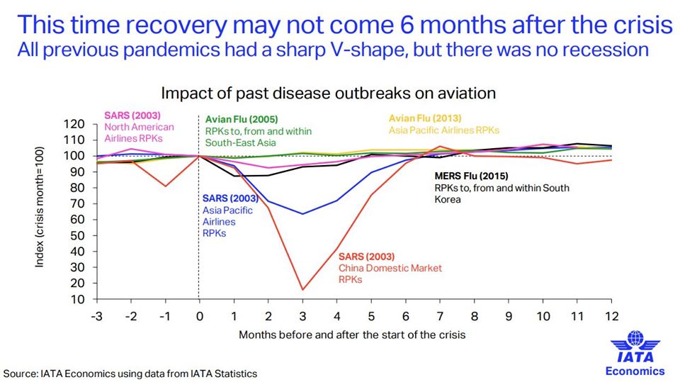 На графіку, опублікованому Міжнародною Асоціацією Повітряного Транспорту (IATA), показаний вплив попередніх спалахів захворювань на авіацію.